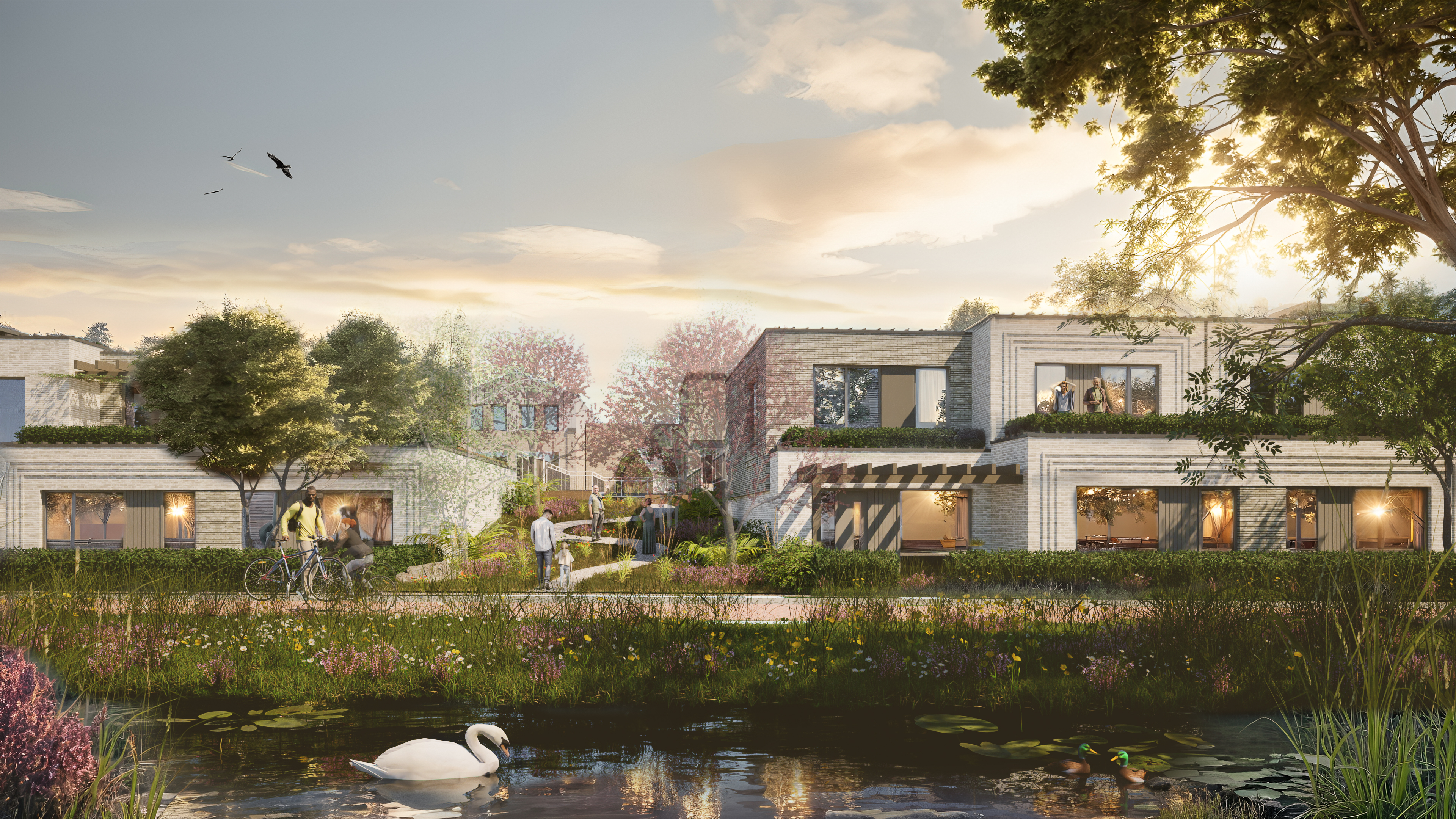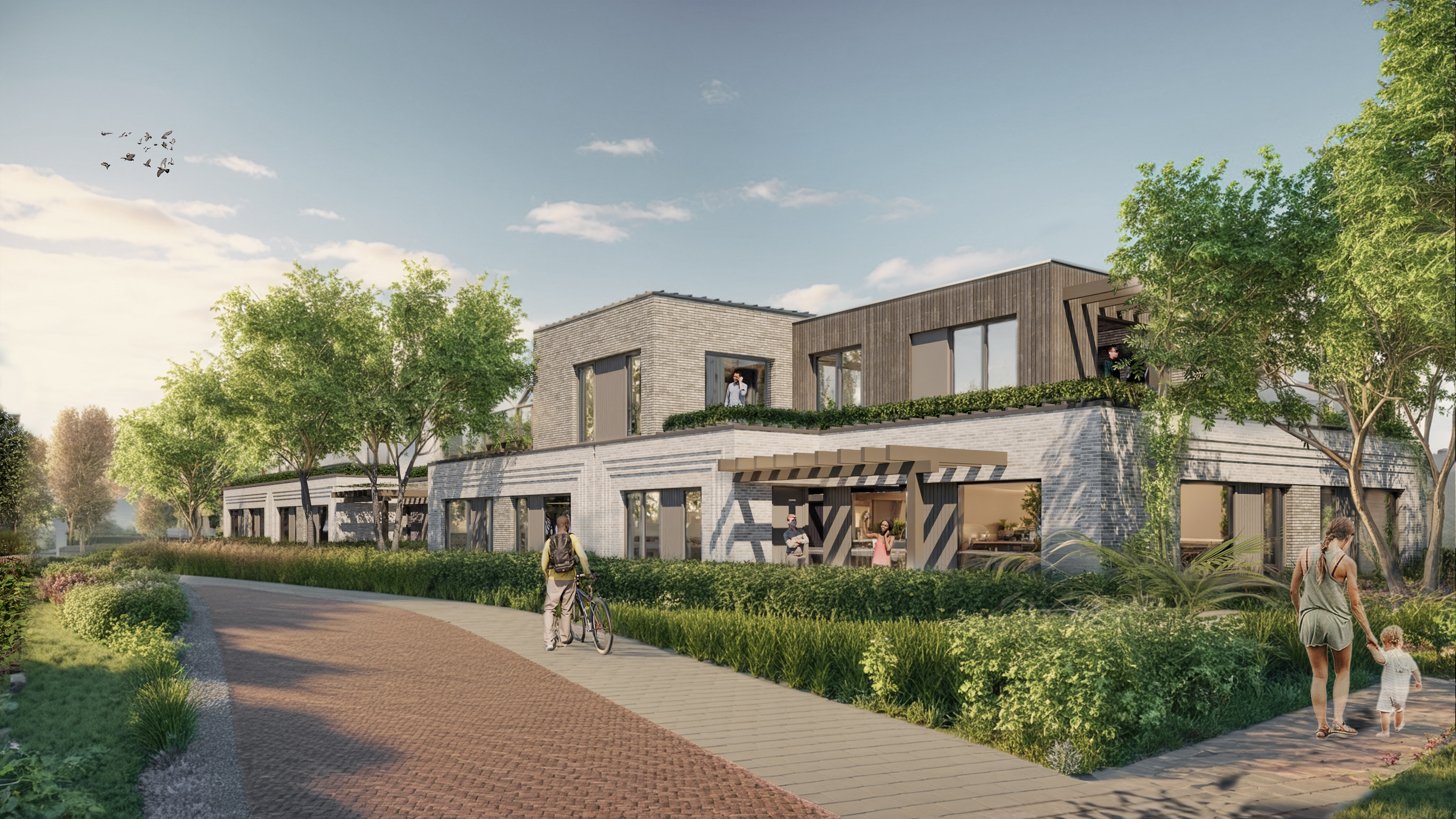 Sculptural terraced houses with spacious outdoor spaces, green roofs, and a clear landscape orientation are situated on the sides along the Ecozone.