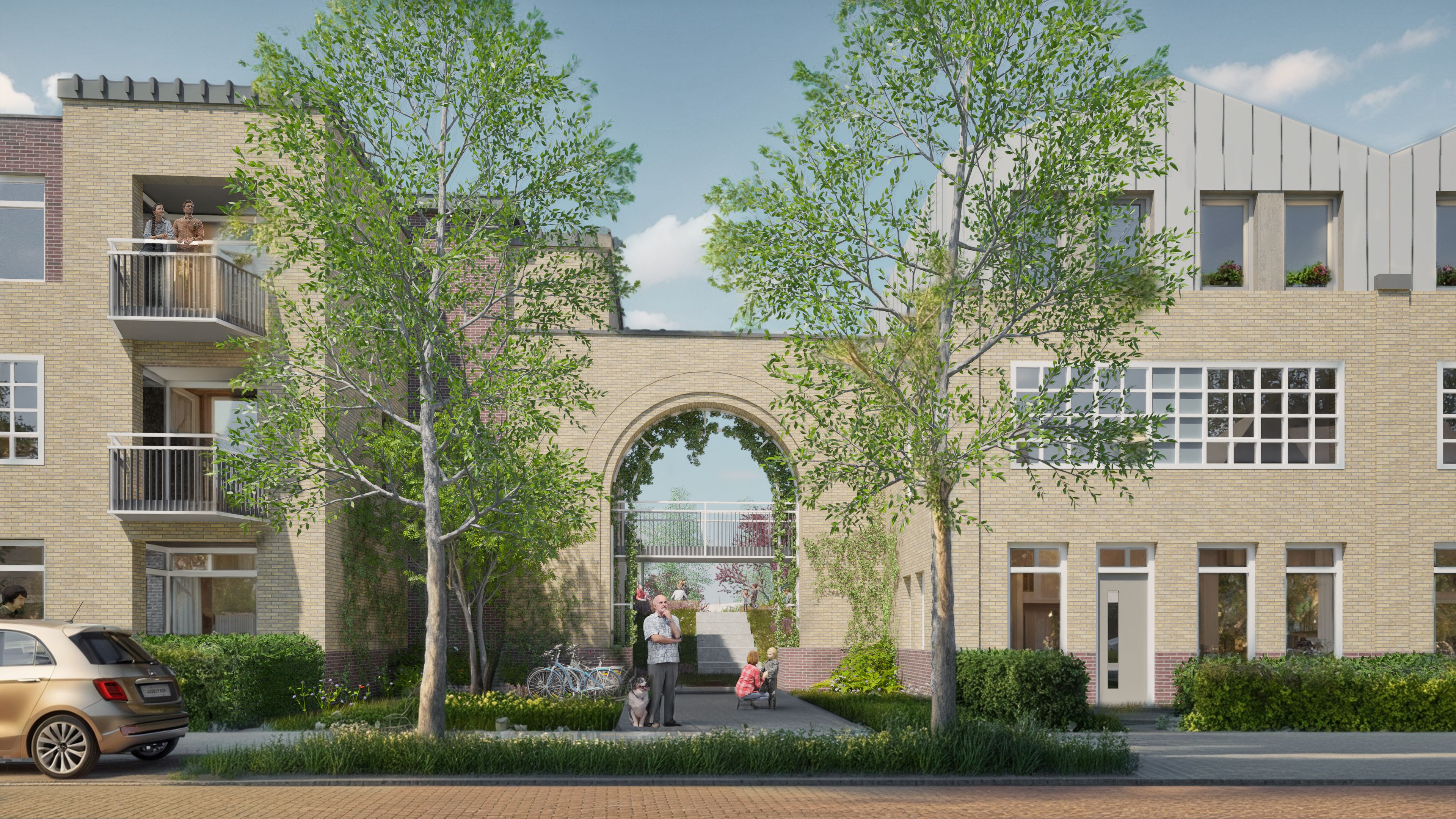 Along the Fluwijn River, the plan features urban architecture inspired by Adriaan Dessing's Fata Morgana, a beautiful Westland plan in the Amsterdam School style. The expressive brickwork, refined detailing, and a distinctive brick gate bring character and urban dynamism. This gate serves as both the symbolic entrance to the neighborhood and the starting point of the central thoroughfare.