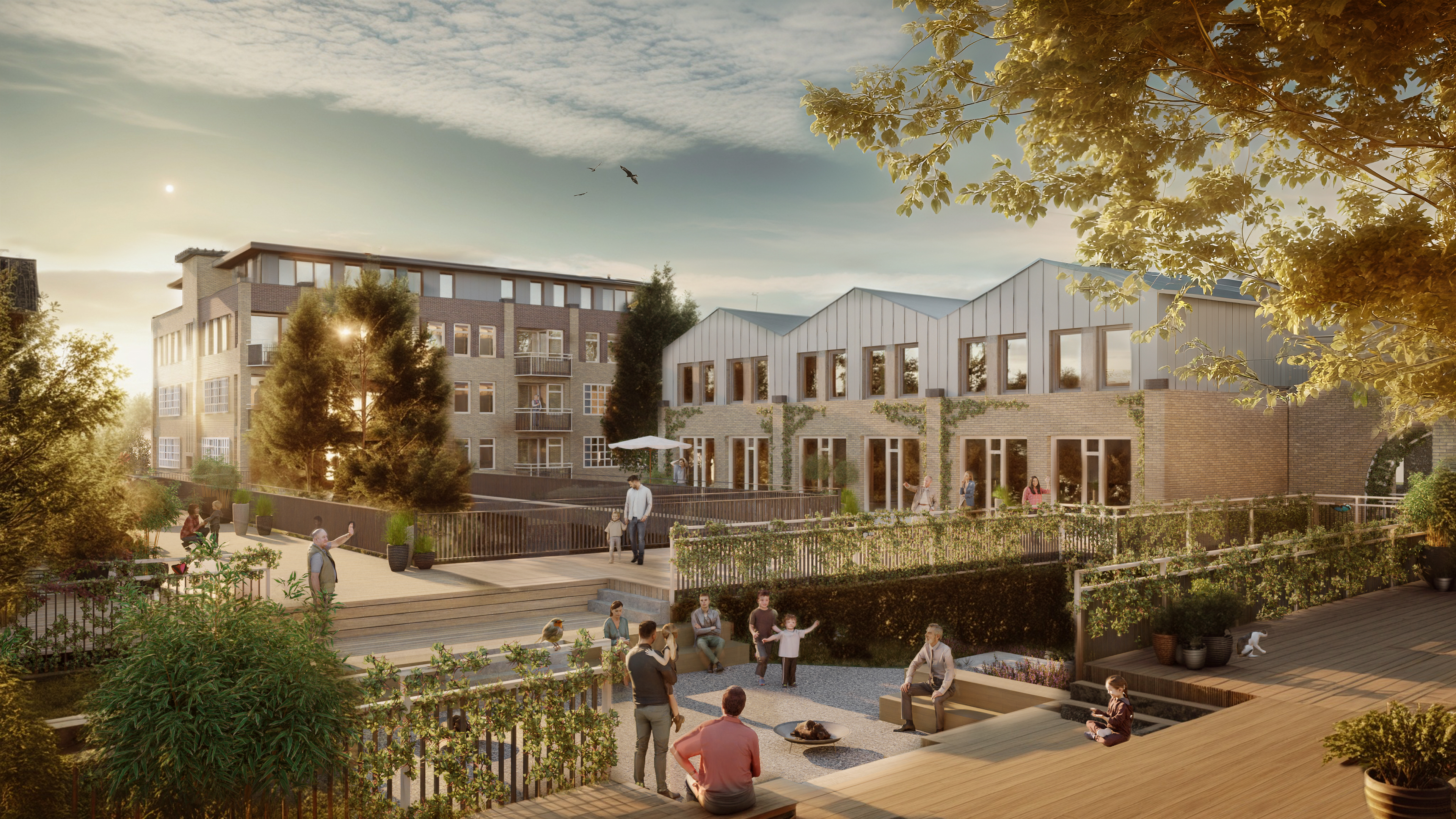 The design builds on the ecological richness of the Ecozone. Green roofs, intensive planting, nesting and bat boxes, and semi-open paving contribute to biodiversity and climate adaptation. Rainwater is buffered through green roofs and integrated planters, while large trees create shade and regulate the outdoor temperature.